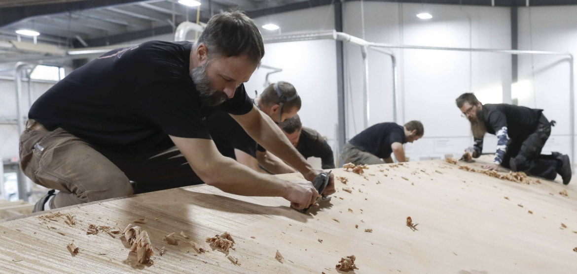 “Each board used in our custom constructions is selected by craftsmen and carefully sorted according to its characteristics, which will determine whether it will be used for structure, aesthetics, or, in some cases, both. Each one is cut and bent by hand according to design specifications, while ensuring that the grain matches throughout the construction. Our wood is used as a unidirectional fiber, as it is much stronger in the direction of the grain than across it. The engineering takes full advantage of this characteristic, and although this precision takes time, it is what sets Van Dam Custom Boat boats apart from other boats in the industry.” BVD.